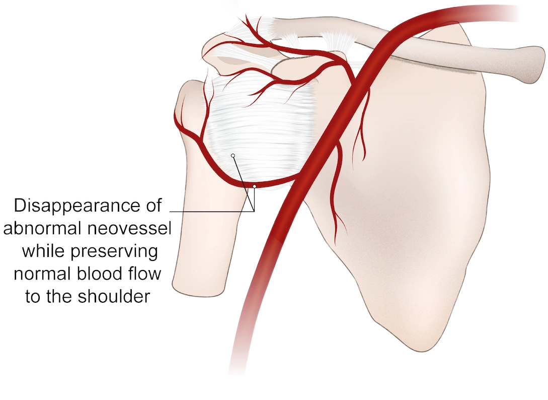 Chronic shoulder pain can be caused by inflammation or overuse of the tissues surrounding the shoulder joint. In many cases, tiny abnormal blood vessels form around these inflamed tissues, which can worsen pain and delay healing. Shoulder Pain Embolization (also known as Transarterial Microembolization – TAME) is a minimally invasive, image-guided procedure that targets and blocks these abnormal vessels, reducing inflammation and promoting recovery.