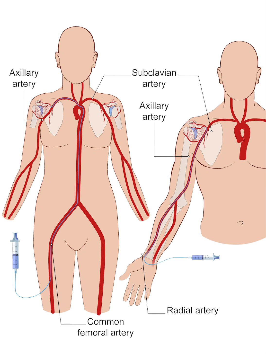 - A small catheter is inserted into an artery (usually in the wrist or groin)