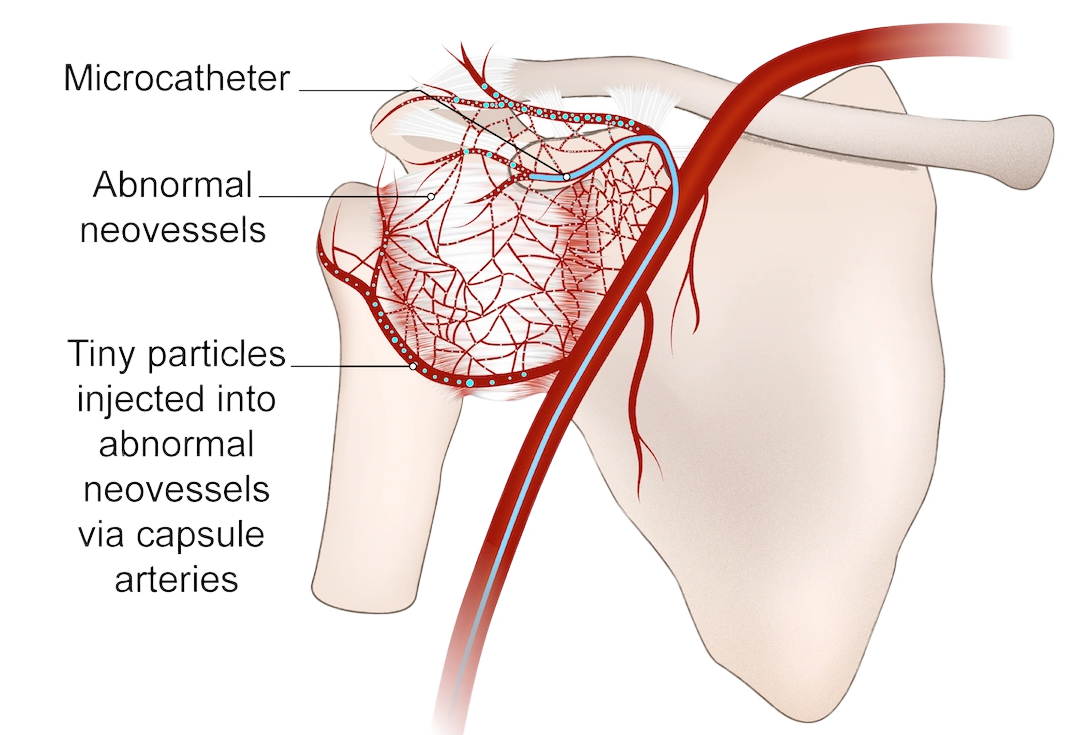 - Under X-ray guidance, the catheter is guided to the arteries supplying the inflamed area of the shoulder